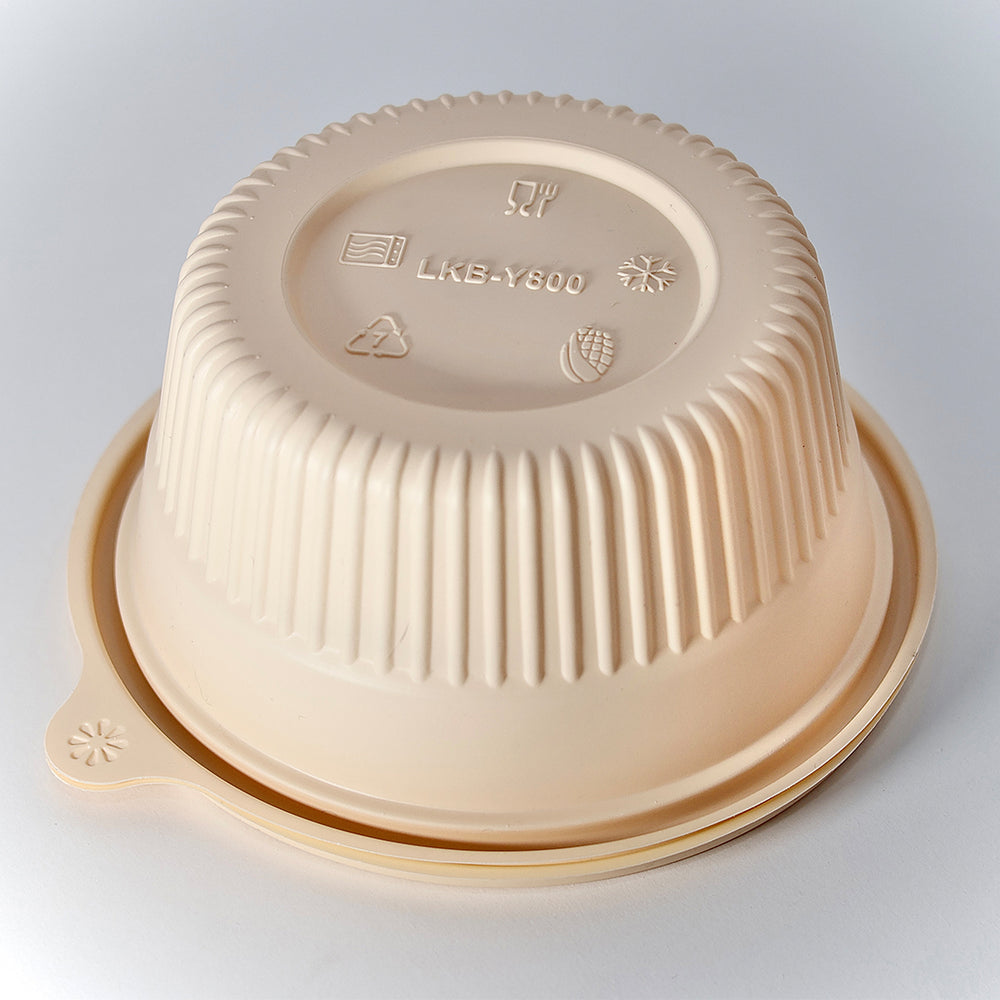 contenedor ecológico de almidón de maíz, incluye tapa del mismo material para una solución 100 % compostable. Su estructura resistente permite contener líquidos calientes sin deformarse, y es apto para microondas. Ideal para ensaladas, sopas, poke bowls y platos calientes o fríos. No altera el sabor de los alimentos y se degrada en condiciones industriales de compostaje. - “Incluye tapa compostable”