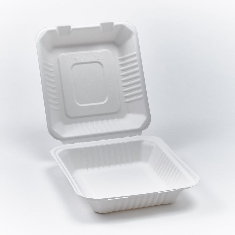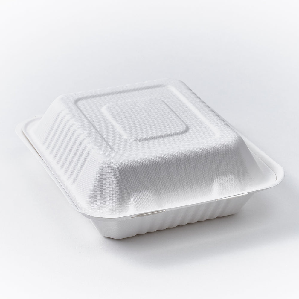 "Contenedor ecológico de una sola cavidad, ideal para platos únicos como arroces, pastas o ensaladas. Hecho de bagazo de caña, soporta alimentos calientes y grasosos sin deformarse. Apto para microondas y compostable. - - “Cavidad única”