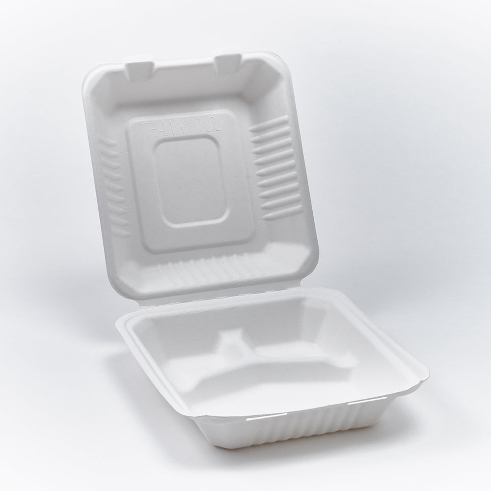 "Contenedor ecológico con tres compartimentos, ideal para separar proteínas, carbohidratos y vegetales sin mezclar sabores. Fabricado en bagazo de caña, resistente a grasas y líquidos, apto para microondas y contacto directo con alimentos. Perfecto para domicilios y menús balanceados. - “3 compartimentos”