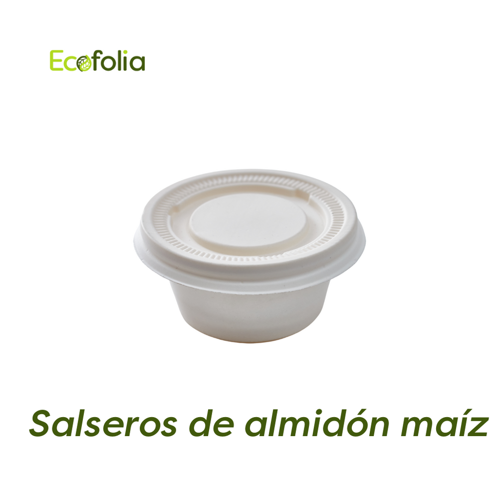 Contenedor ecológico pequeño, ideal para porciones individuales de salsas, aderezos o miel. Fabricado de almidón de maíz y polipropileno con aditivo de descomposición acelerada. Incluye tapa del mismo material. No altera el sabor y es apto para contacto directo con alimentos. - “Incluye tapa compostable”
